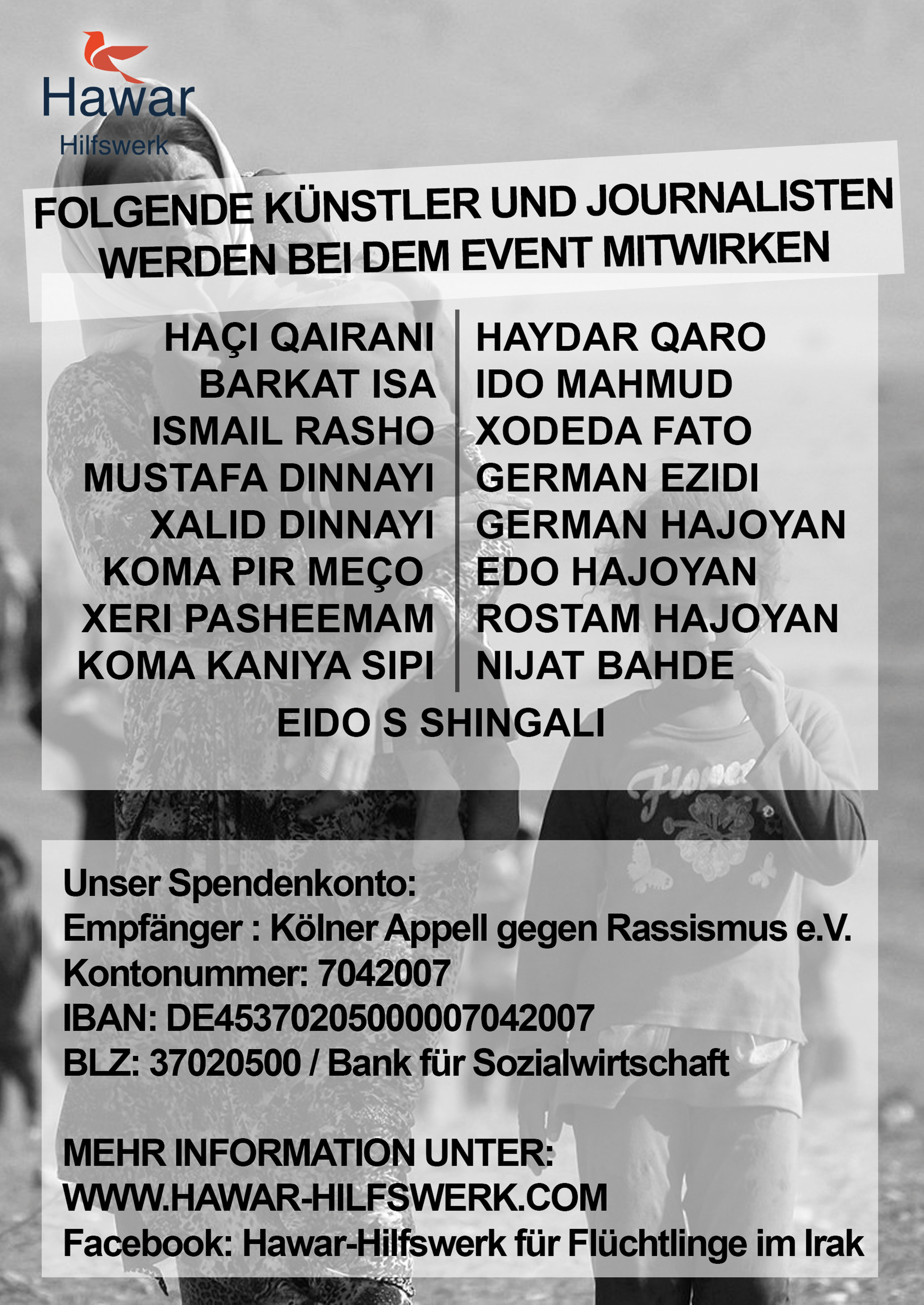 Neben der humanitären Arbeit im Irak unterstützt das Hawar Hilfswerk seit mehreren Jahren ezidische Familien und Frauen, die bei uns in Deutschland Zuflucht gefunden haben, in den verschiedensten Lebenslagen. Wir bieten Unterstützung bei Asylprozessen und stellen Kontakte zu Anwälten her, helfen bei der Bewältigung von Behördengängen, bürokratischen Angelegenheiten und suchen nach einem passenden Deutsch- und Integrationskurs. Bei Anfragen und begrenzter Kapazität bieten wir auch selber Deutsch Nachhilfe an. Das Thema angemessener und bezahlbarer Wohnraum in Köln gestaltet sich schwierig. Jedoch wirken wir auch hier im Rahmen unserer Möglichkeiten unterstützend und begleitend. Des Weiteren ist die Familienberatung der Hauptbestandteil unserer Arbeit, die mit Dolmetschertätigkeiten und Integrationsarbeit nochmals verstärkt wird. Hinzu kommt, dass wir bei der Einschulung der Kinder zwischen Schulen und Familien beratend agieren. Wir arbeiten alle ehrenamtlich. Die Ehrenamtsmitarbeiter sind beruflich in verschiedenen Bereichen tätig, dazu zählen Studenten, Sozialwissenschaftler, Pädagogen, Lehrer und Politologen. Da wir zu 100 Prozent ehrenamtlich arbeiten, haben wir nur begrenzte Möglichkeiten und bitten Sie ihre Anfragen per E- Mail zuzusenden. E-Mail-Kontakt für die Sozialberatung: meral.bayuk@hawar-hilfswerk.com