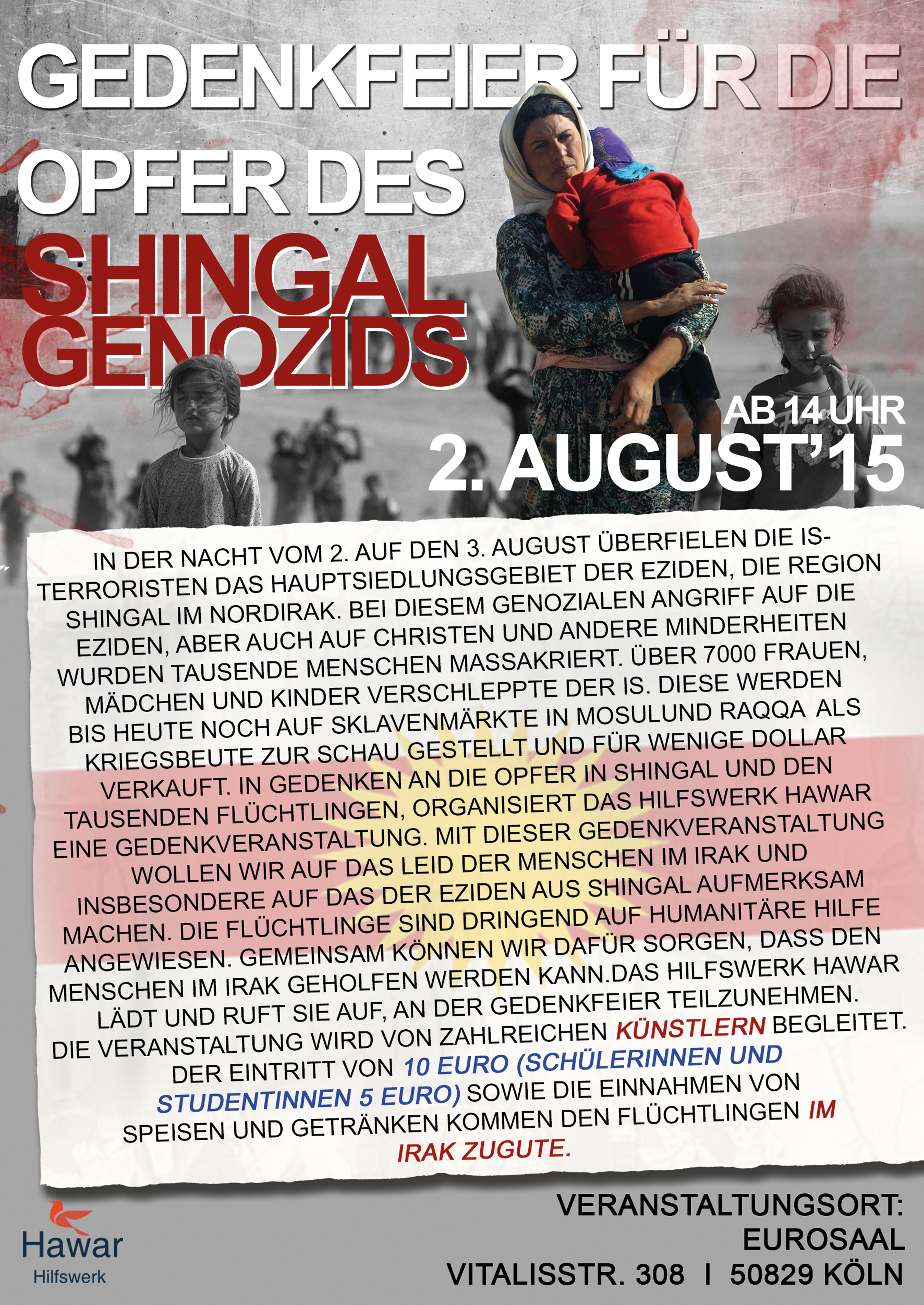 In der Nacht vom 2. auf den 3. August 2014 überfielen Terroristen des Islamischen Kriegs das Hauptsiedlungsgebiet der Eziden, die Region Shingal im Nordirak. Tausende jesidischer Kämpfer wurden brutal hingerichtet. Über 7.000 Frauen, Mädchen und Kinder sind verschleppt. Sie wurden und werden auf Sklavenmärkten in Mousl und Raqqa für wenige Dollar verkauft.
